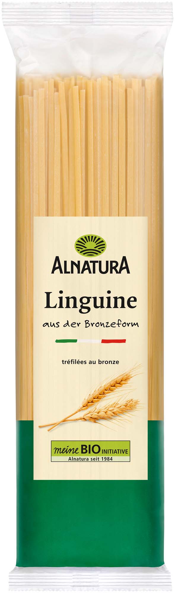 Linguine stammen ursprünglich aus Kampanien im Süden Italiens. Dort werden die langen Nudeln, die im Vergleich zu Spaghetti leicht abgeflacht sind, noch heute gerne zu klassischem Pesto und hellen Saucen serviert. Die Alnatura Linguine werden in Italien nach Bio-Richtlinien aus italienischem Hartweizengrieß in Bronzeformen hergestellt. Ihre Kochzeit beträgt zehn bis elf Minuten.