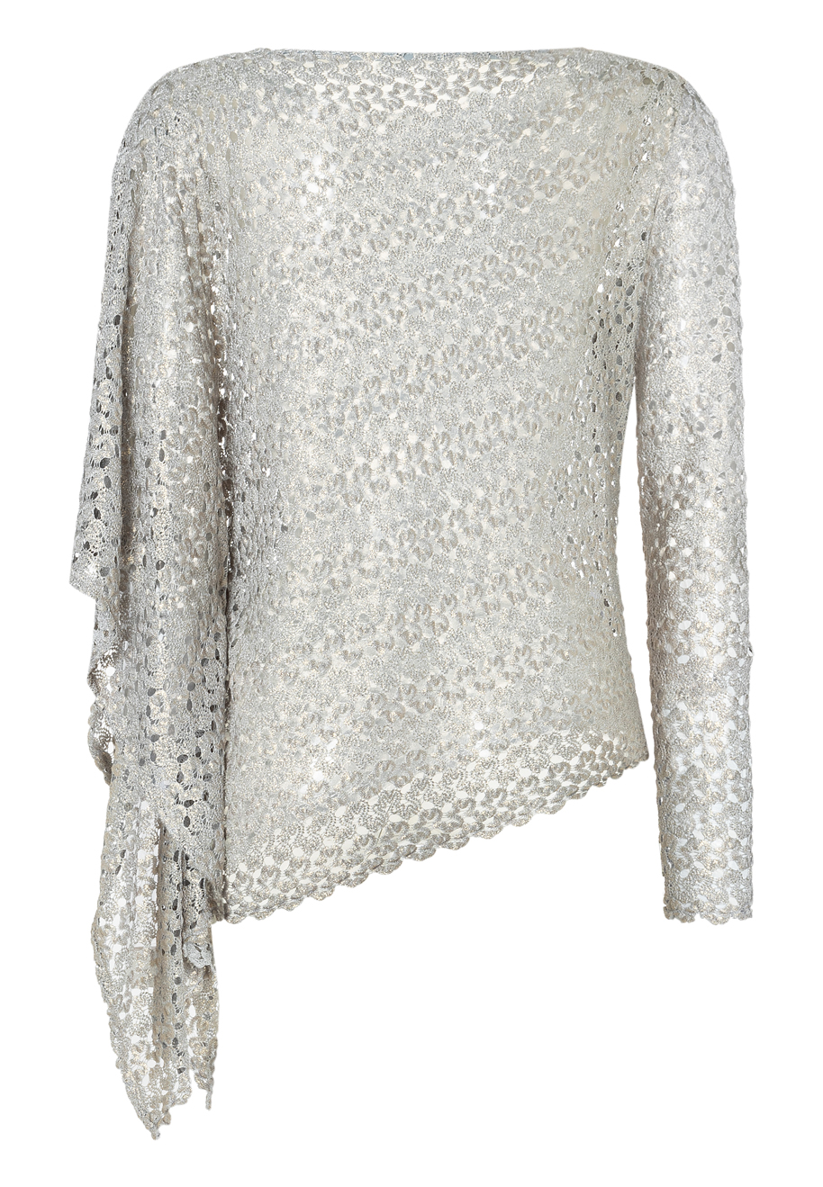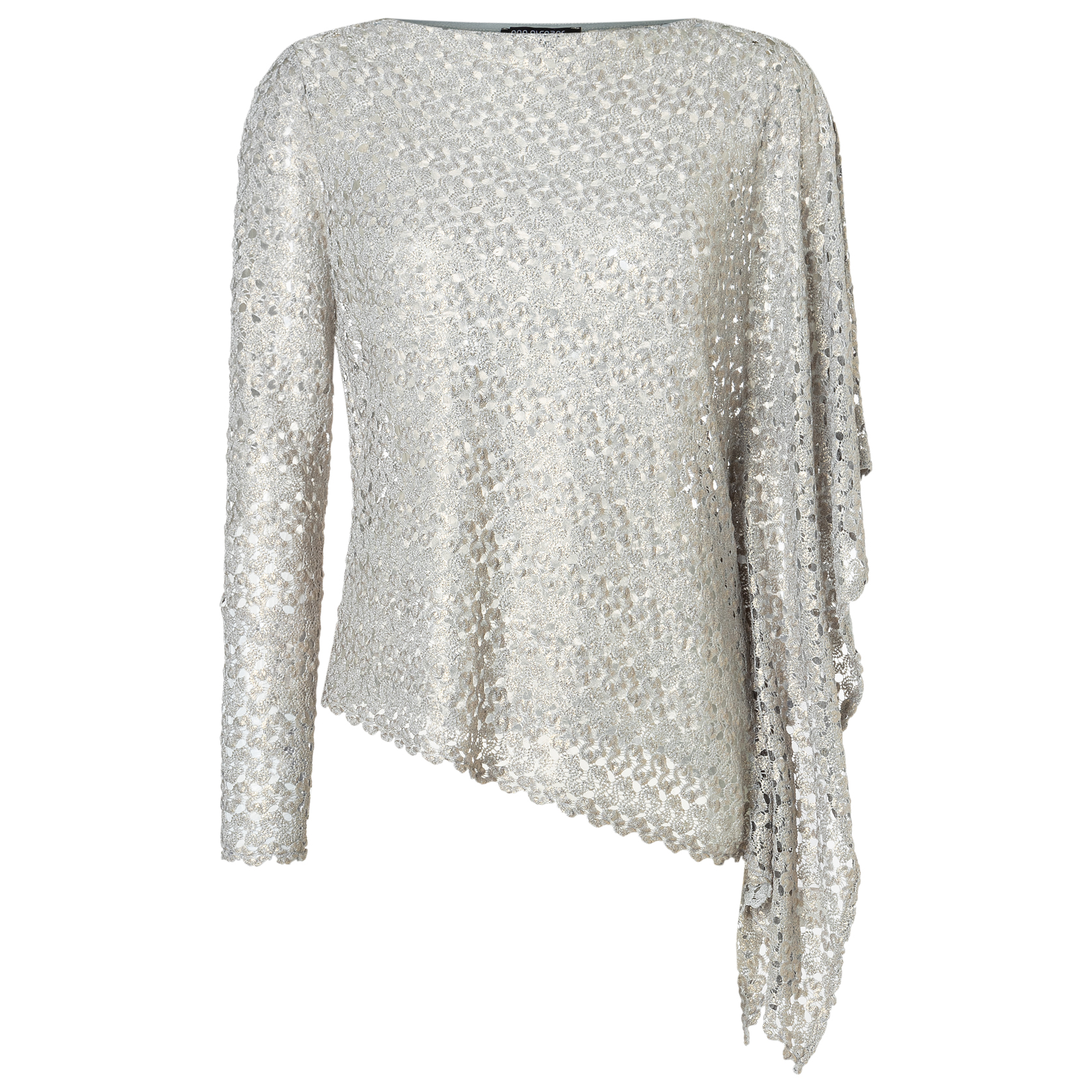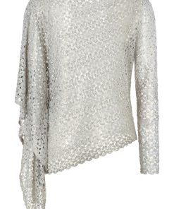 Ana Alcazar Poncho-Top Strick “Silber”. Das asymmetrisches Poncho-Top aus feinem Sommerstrick in Silber ist ein auffälliges und vielseitiges Kleidungsstück. Es begeistert durch den leichten semitransparenten Sommerstrick mit einem langen Ärmel und einem Fledermausärmel. Ein Hingucker egal für welche Gelegenheit.