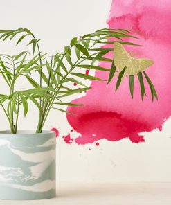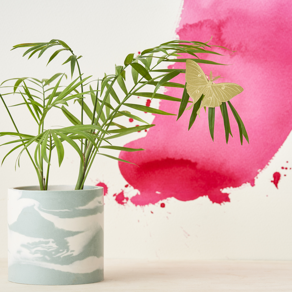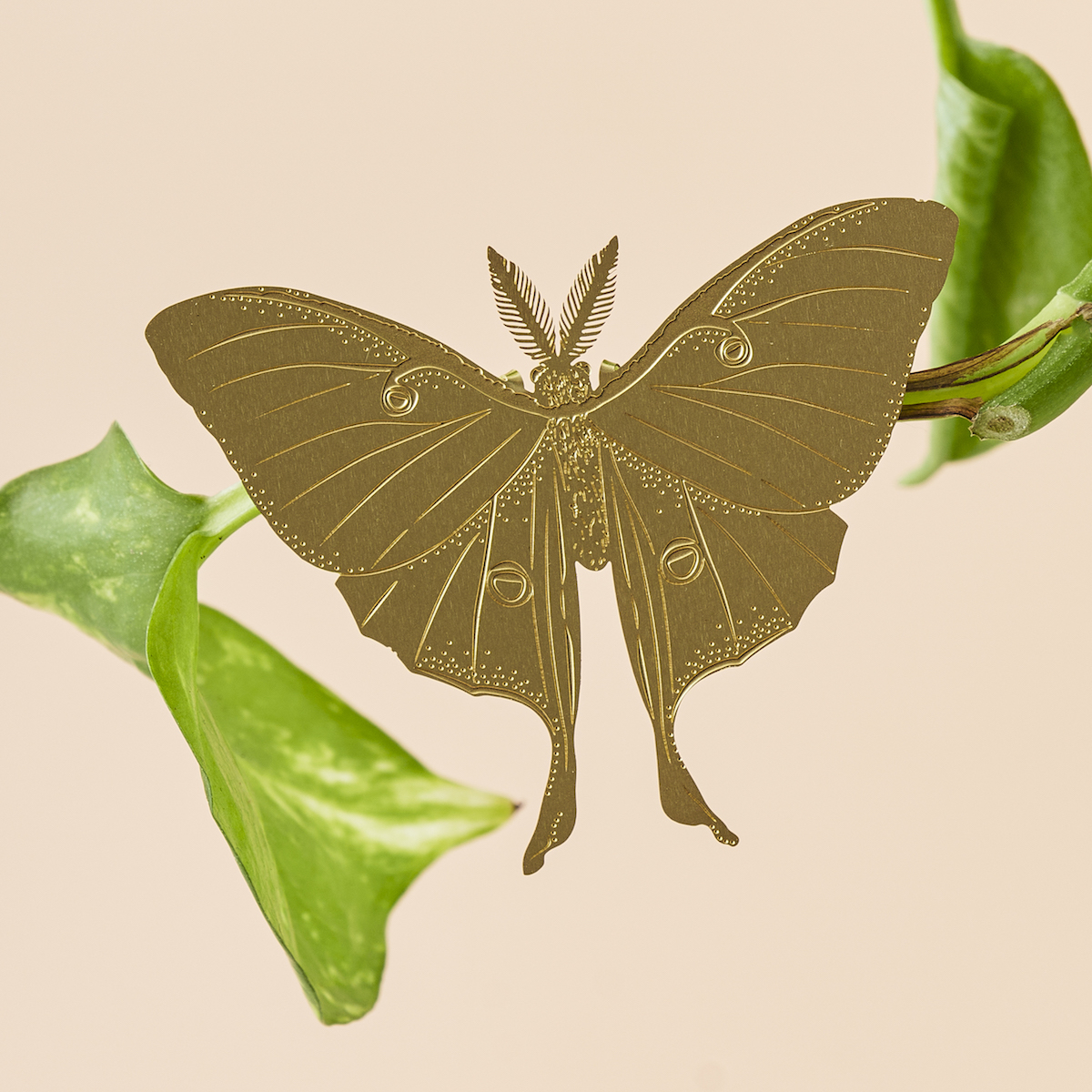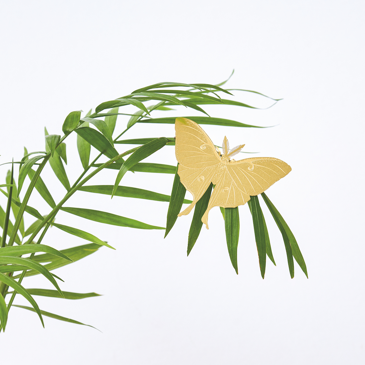 Inspiriert ist die Zimmerpflanzendekoration von der seltenen, in Nordamerika lebenden Mondmotte (Actias Luna). Die Flügel, Fühler und der Körper des Falters sind mit aufwendig geätzten Details versehen. Wenn Sie genau hinschauen, werden Sie staunen, wie schön dieser außergewöhnliche Nachtfalter ist.