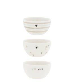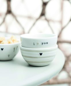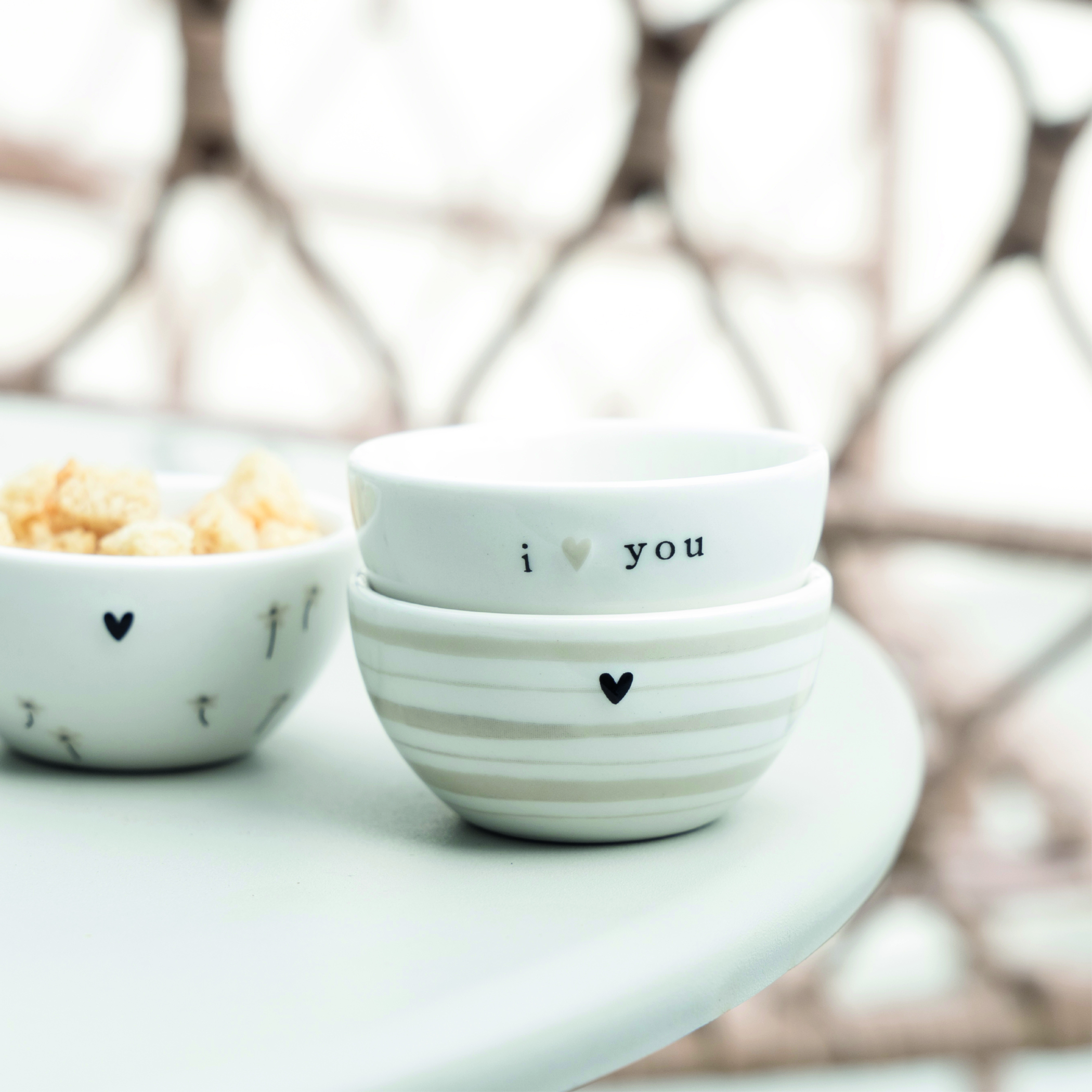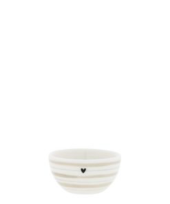 Bastion Collections Schüssel Mini “Hearts & Stripes”. Diese süße Schüssel von Bastion Collection hat das perfekte Fassungsvermögen für Früchte, Dips oder andere Leckereien, aber auch Gewürze lassen sich darin gut auf dem Tisch drapieren. Egal ob am Frühstückstisch oder auf der Kuchentafel – Hier darf diese Schüssel mit dem kleinen Herzchen nicht fehlen.