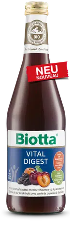 Der Biotta Vital Digest besteht aus saftigen Bio-Pflaumen, Bio-Dörrpflaumen und handverlesenen Bio-Aprikosen. Pflaumen, frisch oder gedörrt, enthalten von Natur aus wertvolle Ballaststoffe. Als Ballaststoffe werden Nahrungsbestandteile bezeichnet, die im Verdauungssystem des Menschen nicht oder nur unvollständig abgebaut werden können. Sie kommen fast ausschliesslich in Pflanzen vor und sind für ihre positive Auswirkung auf die Darmbewegung bekannt. Dem in Pflaumen enthaltene Pektin und Sorbit wird ebenfalls nachgesagt, den Darm zu aktivieren. Biotta Vital Digest eignet sich besonders für einen schwungvollen Start in den Tag und sollte vor den Mahlzeiten eingenommen werden.