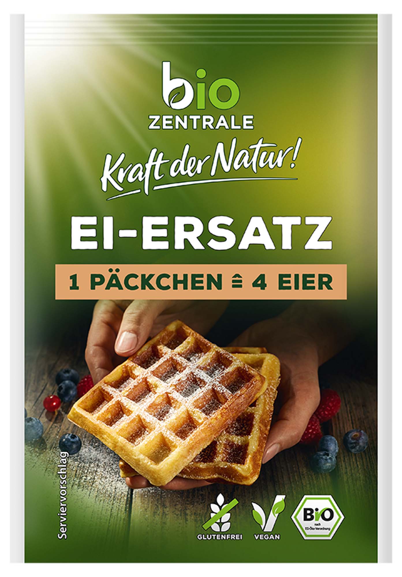 Unser biozentrale Ei-Ersatz ist von Natur aus vegan und bietet vielfältige Möglichkeiten zur Zubereitung leckerer Gerichte und selbstgebackener Köstlichkeiten. Ob süßes oder herzhaftes Gebäck, saftiger Rührkuchen, fluffige Waffeln, Pfannkuchen, Aufläufe oder Gemüse- und Kartoffelpuffer – mit unserem Ei-Ersatz gelingen diese einwandfrei. Einfach und schnell das Pulver mit Sprudelwasser angerührt.