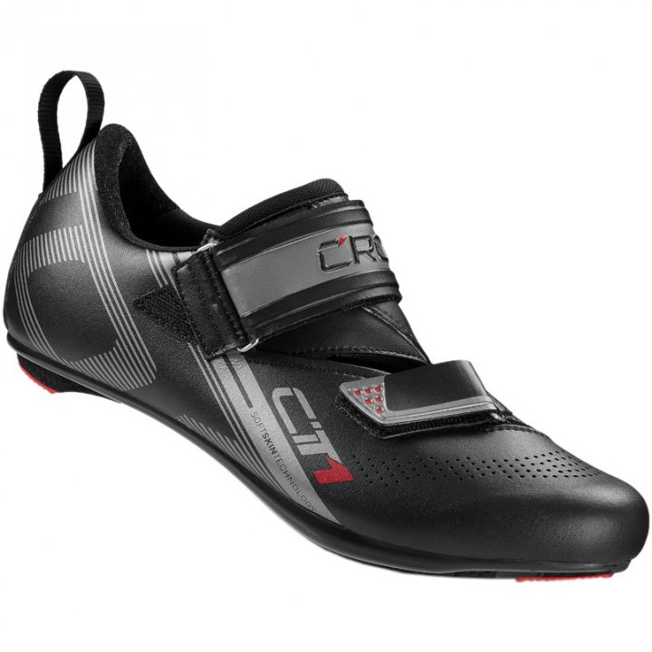 Die verarbeiteten Materialien halten den Fuß trocken und sorgen für wunderbaren Tragekomfort. Die große Schlaufe an der Ferse, die den Einstieg in den Schuh erleichtert, ein an der Seite angebrachter Faden, mit dem der Schuh bereits an der Pedale befestigt werden kann (was besonders beim Umsteigen auf das Rad in der Wechselzone beim Triathlon praktisch ist) und das rutschfeste Futter, das die Ferse fest im Schuh hält, machen den CT1 einzigartig.
