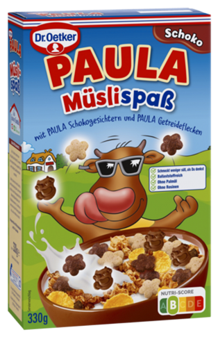 PAULA gibt es nun auch im Müsliregal! Der Dr. Oetker PAULA Müslispaß kommt in der beliebten Geschmacksrichtung Schoko und überzeugt die ganze Familie mit kuhlen PAULA-Schokogesichtern und Getreideflecken. In Kombination mit unserem leckeren Knuspermüsli als Basis bietet es ein spaßiges Knuspererlebnis und schmeckt dabei weniger süß, als man denkt. PAULA Müslispaß – ein echtes Highlight auf dem Frühstückstisch!