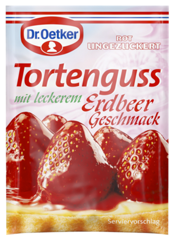 Passend zur Saison für Erdbeertorten gibt es Tortenguss mit Erdbeer-Geschmack. Mit diesem Tortenguss kommen die Erdbeeren auf Ihrer Torte mehr als glänzend zur Geltung! Denn der leckere Erdbeer-Geschmack unterstreicht das fruchtig-frische Aroma der Erdbeeren und garantiert so maximalen Genuss. Dr. Oetker Tortenguss mit Erdbeer-Geschmack ist einfach in der Zubereitung, gelingsicher und schnittfest. Der Beutelinhalt – mit Zugabe von Zucker – ist ausreichend für 250 ml Wasser.