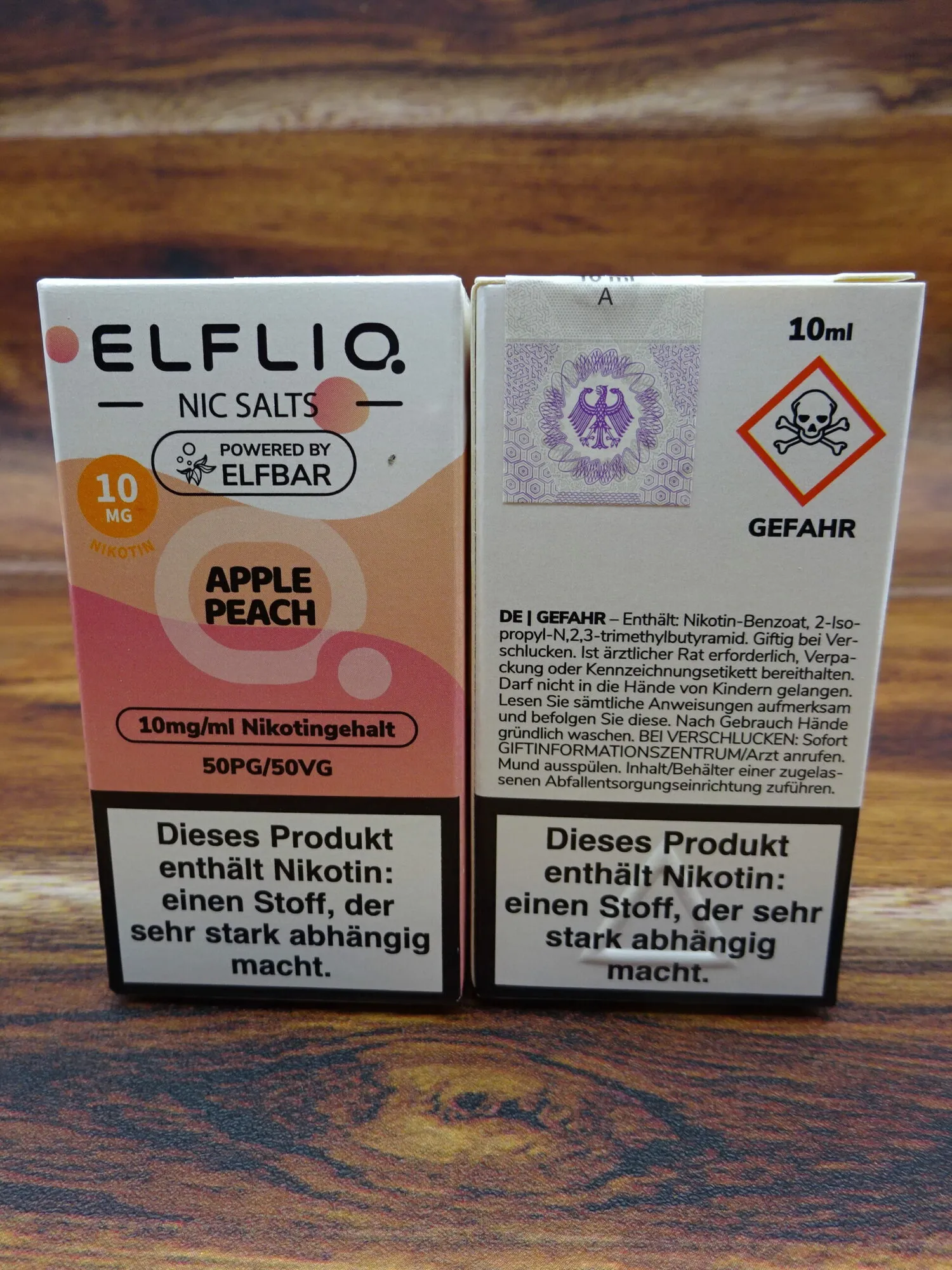 Das Elfliq Apple-Peach Nikotinsalz-Liquid Elfbar ist ein mega Geschmackserlebnis aus saftig süßem Pfirsich und knackig saurem Apfel. Der säuerliche Apfel dominiert beim Einatmen und der süße Pfirsich beim Ausatmen, ein wirklich sehr interessantes Liquid.