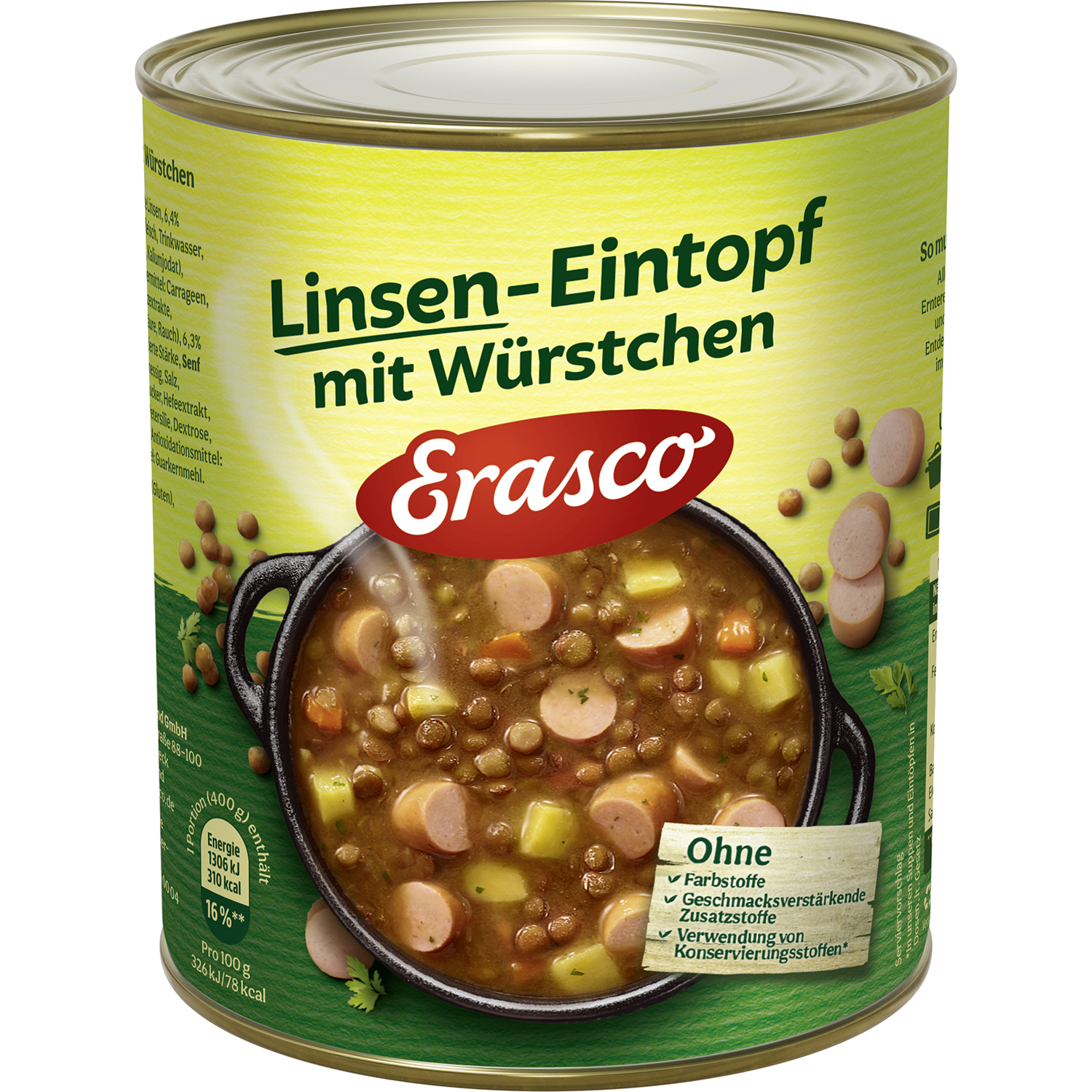 Mit frischem Gemüse & Kräutern. Bei vielen beliebt und schon aus Kindheitstagen bekannt: Unser Erasco Linsen-Eintopf mit Würstchen. Aus ausgesuchten Linsen, leckeren Würstchen und erntefrischen Möhren und Kartoffeln von deutschen Vertragsbauern bereiten wir unseren beliebten Eintopf nach unverwechselbarer Erasco-Rezeptur zu. So schmeckt er einfach am besten!