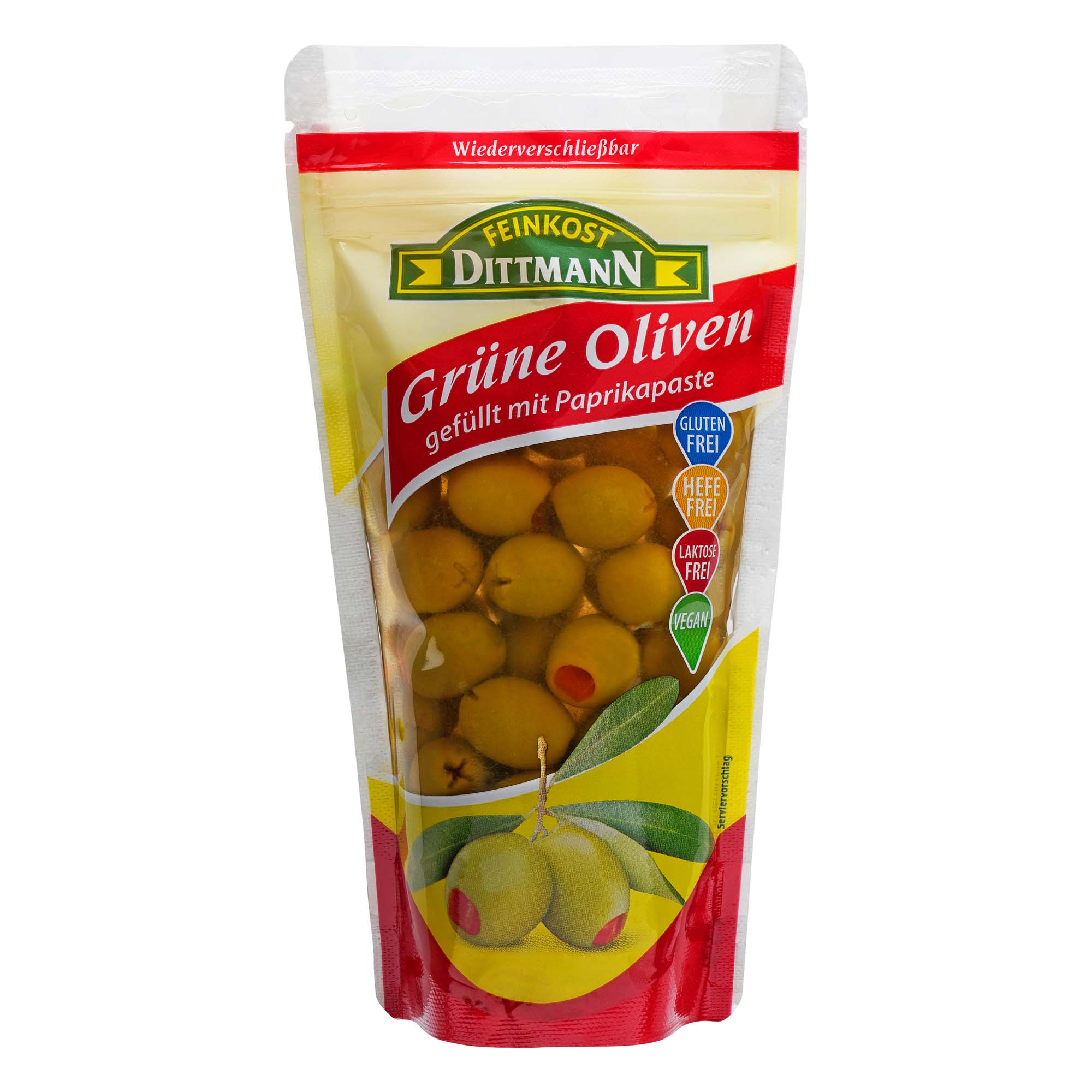 Exklusiv von den sonnenverwöhnten Feldern Südspaniens erhält Feinkost Dittmann diese ausgewählt schmackhaften Oliven. Genießen Sie die feinen grünen Oliven gefüllt mit einer leckeren Paprikapaste.