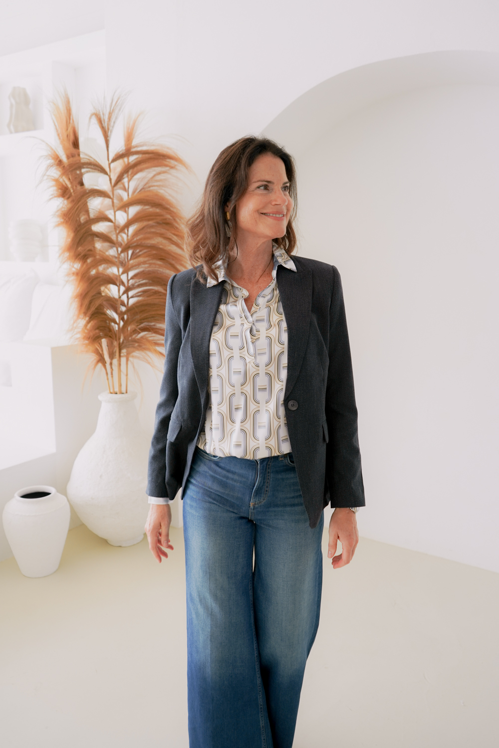Die Farbe ist durch die Materialzusammensetzung leicht meliert. Er hat Details wie feine Nähte, einen Knopf und ein gefüttertes Innenfutter verleihen dem Blazer einen Hauch von Luxus.