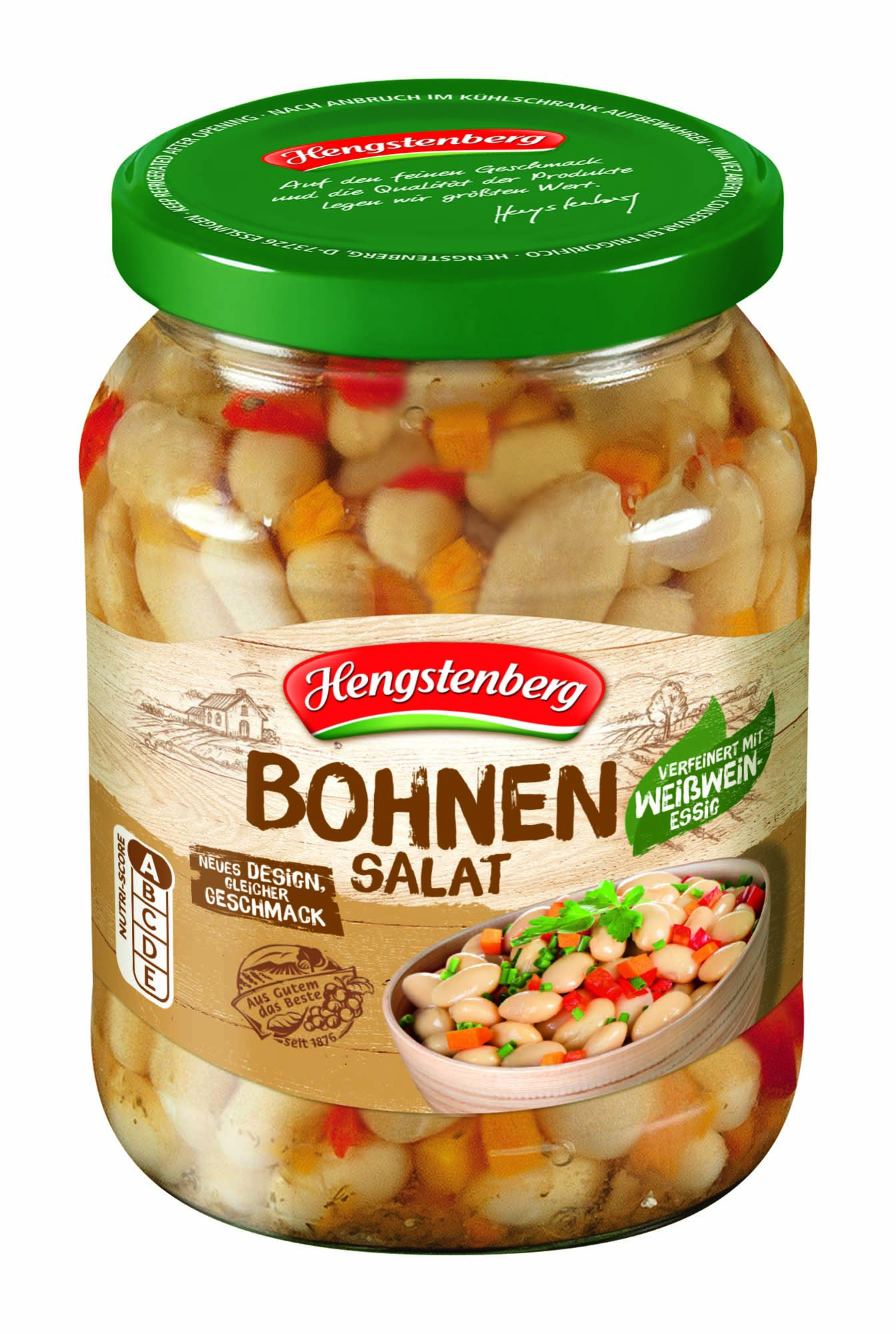 In unserem Hengstenberg Bohnensalat steckt die volle Power an Hülsenfrüchte und Gemüse. Wir verwenden ausgewählte weiße Bohnenkernen und verfeinern sie mit einem harmonischen Mix aus Tomatenpaprika-, Karotten- und Zwiebelstückchen. Eingelegt in einen raffiniert würzigen Weißweinessig-Aufguss mit Bohnenkraut bekommt unser Bohnensalat seinen typischen Geschmack. Damit bringst du ganz einfach Hülsenfrüchte auf den Tisch. Der Salat ist eine schnelle Beilage für kalt-warme Gerichte, eine gute Mahlzeit zwischendurch oder eine Ergänzung zu weiteren Salaten.