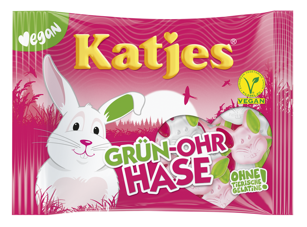 Bei unserem fruchtig süßen Grün-Ohr Hasen ist der Name Programm, denn sein linkes Fruchtgummiohr ist grün und steht für leckeren veganen Genuss! Es schmeckt nach Erdbeere und passt perfekt zum roten Ohr mit Cassisgeschmack. Die rosa Schaumzuckerhäschen schmecken lecker nach Himbeere und die Weißen nach Kirsche. Wie bei allen Katjes-Fruchtgummis verwenden wir auch hier nur natürliche Aromen und Farben. Da kann wirklich niiiiiemand widerstehen.