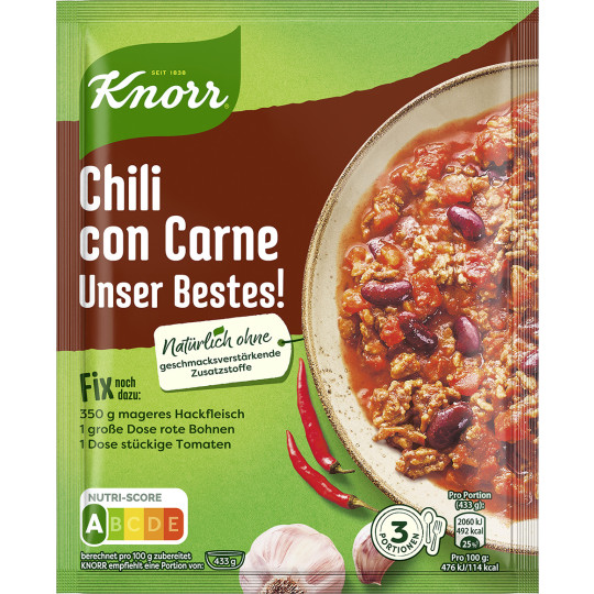 Chili-Fans aufgepasst! Durch Zugabe von stückigen Tomaten bekommt dieses Chili con Carne einen extra fruchtig-tomatigen Geschmack. Mit den KNORR Fix Produkten begeisterst du deine ganze Familie. Mit der beliebten Würzbasis gelingen authentische und abwechslungsreiche Gerichte garantiert.