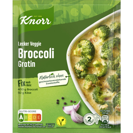 Knorr Fix Lecker Veggie Broccoli Gratin ist eine Würzmischung für Gerichte für den anspruchsvollen Gaumen. Mit der Würzmischung gelingt ein schmackhaftes Ofengericht oder ein Auflauf mit anderem Gemüse wie Blumenkohl, Karotten oder Erbsen im Handumdrehen. Zutaten für 2 Portionen: 400 g Broccoliröschen (frisch oder tiefgekühlt) und 50 g geriebener Käse (16% Fett)