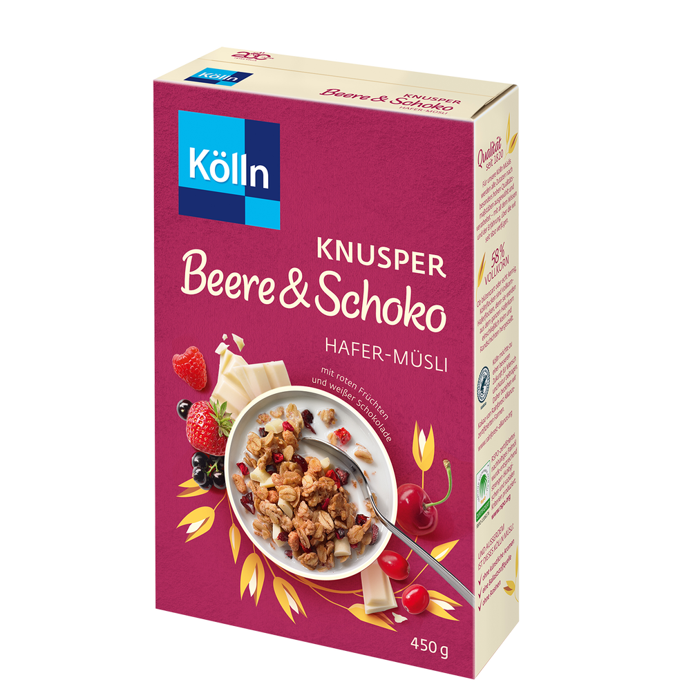 Kölln Knusper Beere & Schoko Hafer-Müsli ist ein Mix aus knusprigen Haferstückchen, vielen roten Früchten (Cranberrys, Erdbeeren, Sauerkirschen, Himbeeren und schwarzen Johannisbeeren) sowie weißer Schokolade und überzeugt jeden Feinschmecker.