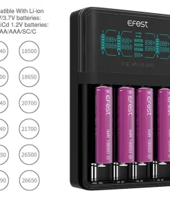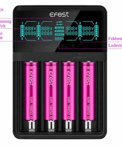 Das Ladegerät Efest LUC V4 Elite ist die neueste Weiterentwicklung und ermöglicht zusätzlich das sichere Aufladen von großen Akkus der Typen 21700, 20700 oder 26650 in kürzester Zeit. Außerdem können auch handelsübliche AA, AAA NiMh/NiCd Akkus hiermit wieder aufgeladen werden. Ein 12V 2A Netzteil ermöglicht Ladeströme von bis zu 4A insgesamt und 2A für einen Ladeschacht.