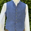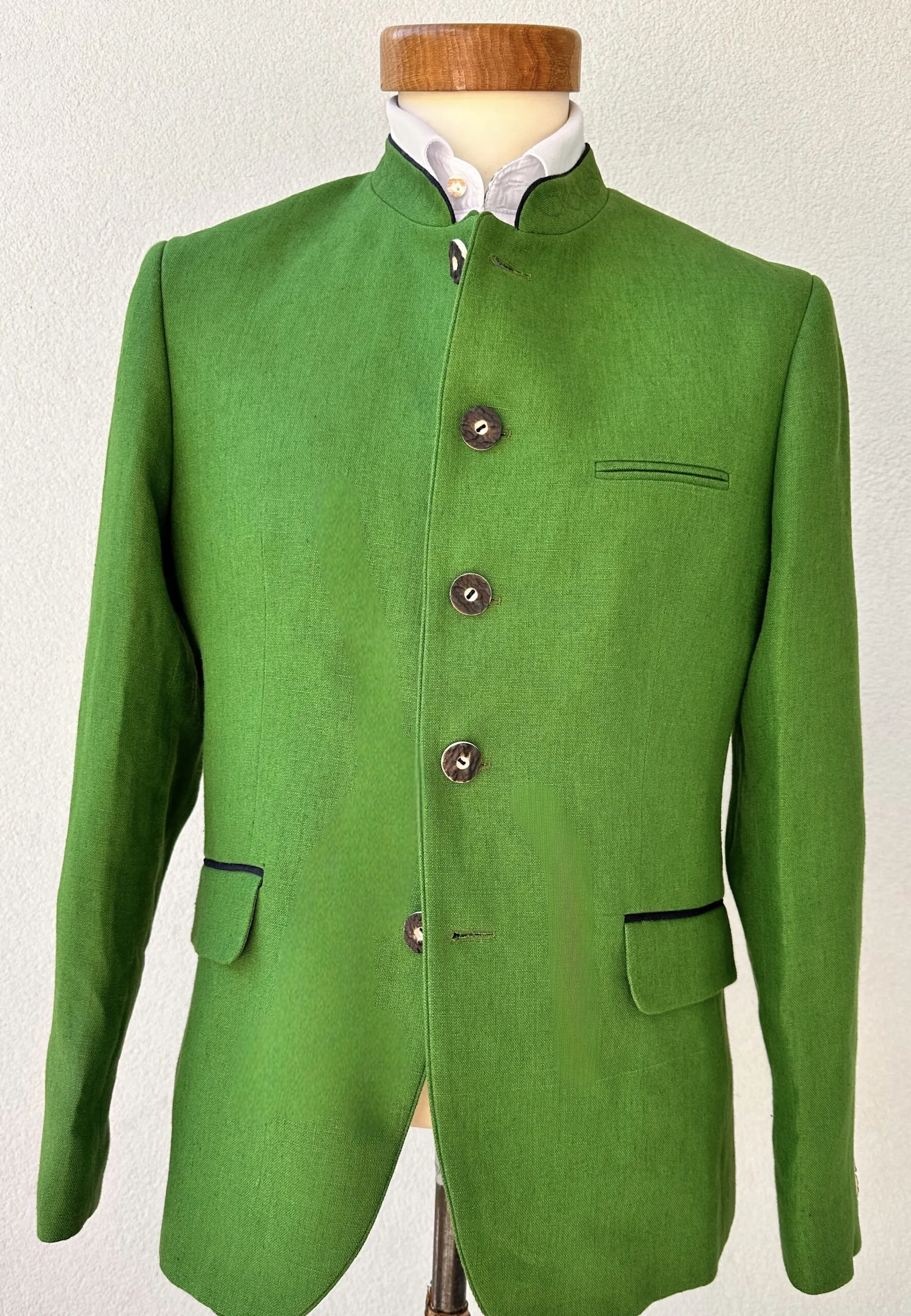 Österreichisches Trachtensakko aus 100% Leinen in kräftigen Wiesengrün mit Kontrast in marinefarbenen Leinen.