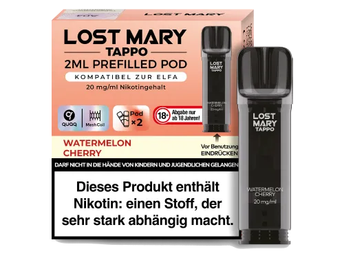 Lost Mary Tappo Watermelon-Cherry ist der passgenau vorbefüllt Pod für den Lost Mary Tappo Akku. Er wir d ganz einfach auf den Akku aufgesetzt. Der Lost Mary Tappo Pod hat ein Tankvolumen von 2 Milliliter und einen vorinstallierten QUAQ Mesh Coil mit einem Widerstand von 1,2 Ohm. Das jeweilige im Pod befindliche Nikotinsalz Liquid hat eine Nikotinstärke von 20mg/ml. Der Lost Mary Tappo Pod ist nicht wieder nachfüllbar. Damit Sie genügend Vorrat haben, befinden sich immer zwei PreFilled Pods ihrer Geschmacksauswahl in einer Verkaufseinheit. Der Pod ist darüber hinaus zu 100% kompatibel mit dem Elfbar Elfa Akku.