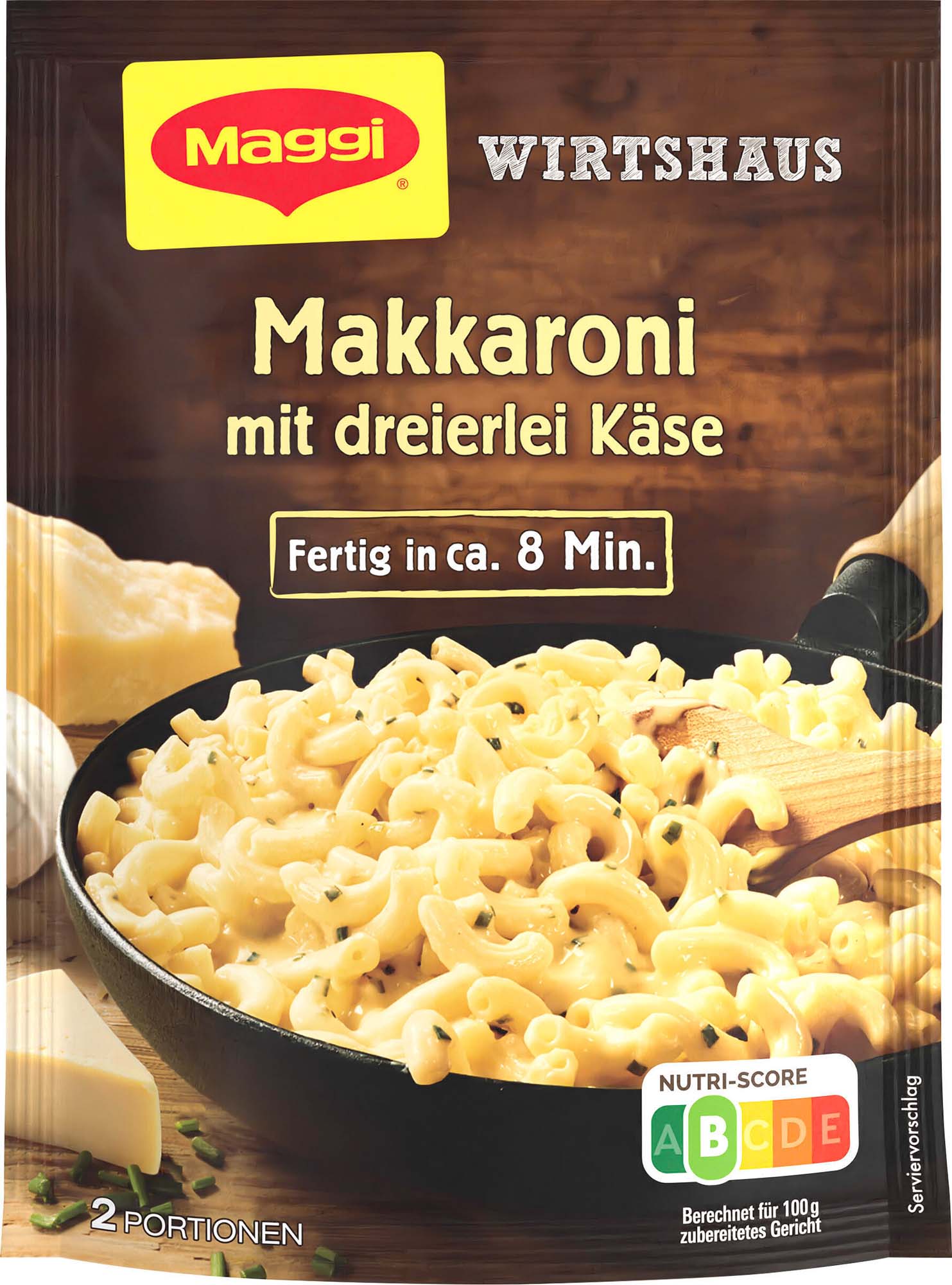 Makkaroni mit Käse – ein leckeres, traditionelles Gericht aus dem Wirtshaus. Wer das deftige Pfannengericht mit Nudeln und einer Kombination aus drei Käsesorten auch in der heimischen Küche zubereiten möchte, ist mit Maggi Wirtshaus Makkaroni mit dreierlei Käse perfekt ausgestattet.