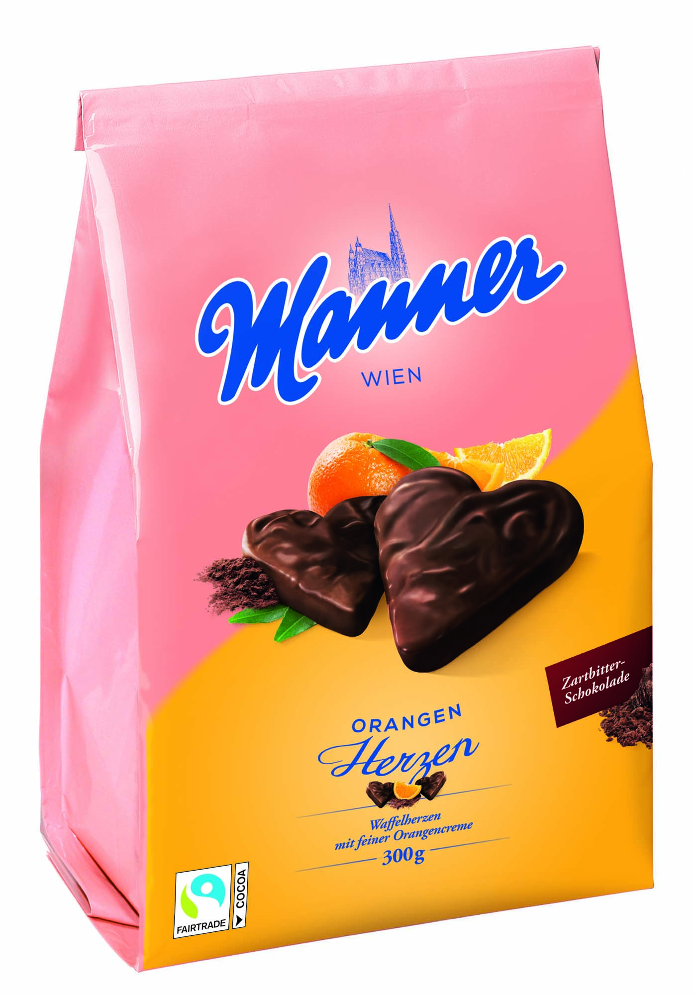 Drei Lagen zarte Waffeln, dazwischen zwei Schichten fruchtige Orangencreme und überzogen mit feinherber Zartbitterschokolade. Für den besonders liebevollen Genuss überzeugt diese fruchtige Köstlichkeit in Herzform. Als ideale Ergänzung zu den Manner Rum-Trüffelcreme Herzen oder einfach zum Genießen für Groß und Klein.