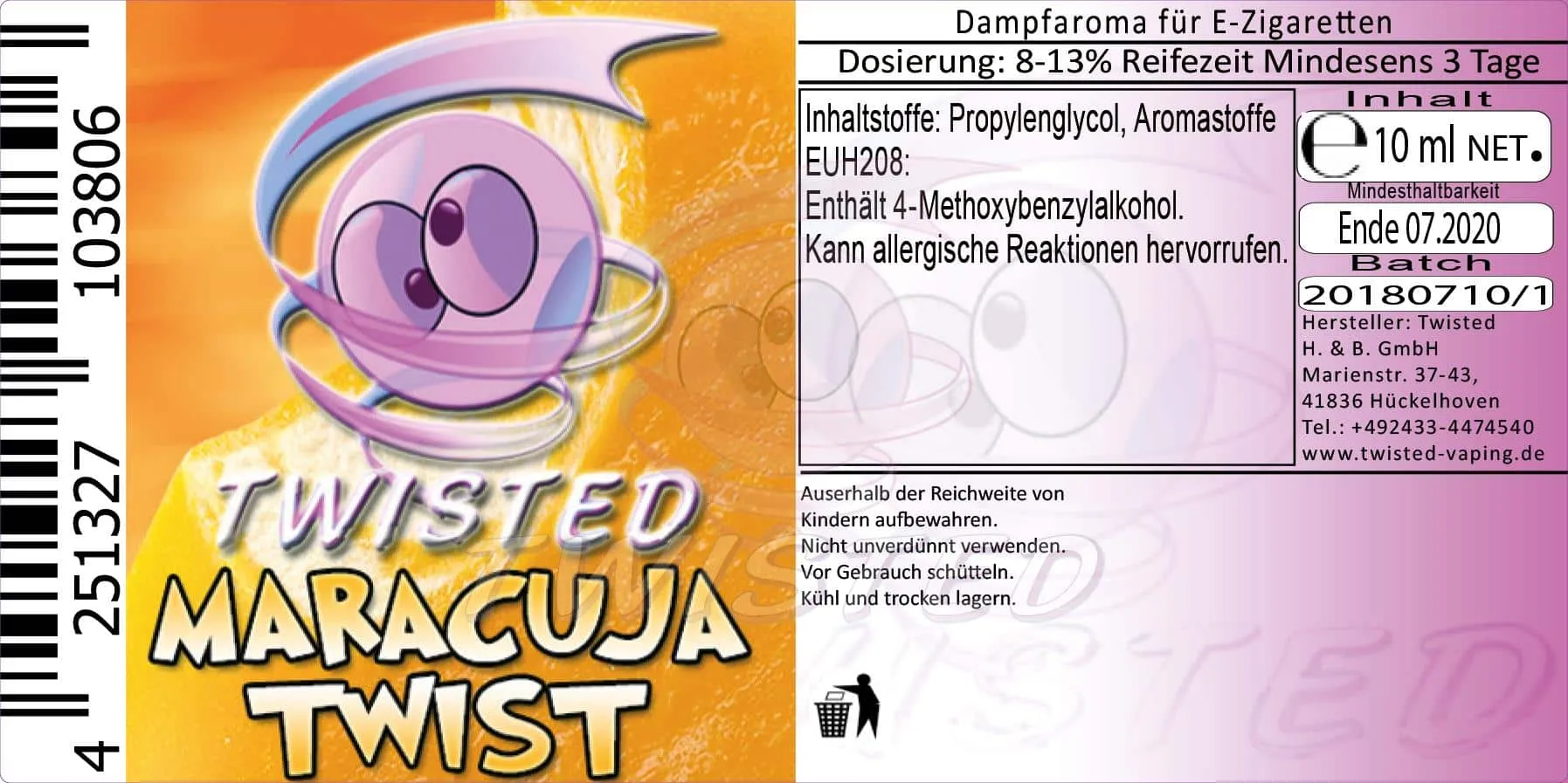 Das Maracuja twist Aroma von Twisted-Vaping wird in 10 ml Braunglasflaschen mit PU Dichtung, Kindersicherung und Orginalitätsverschluß geliefert.