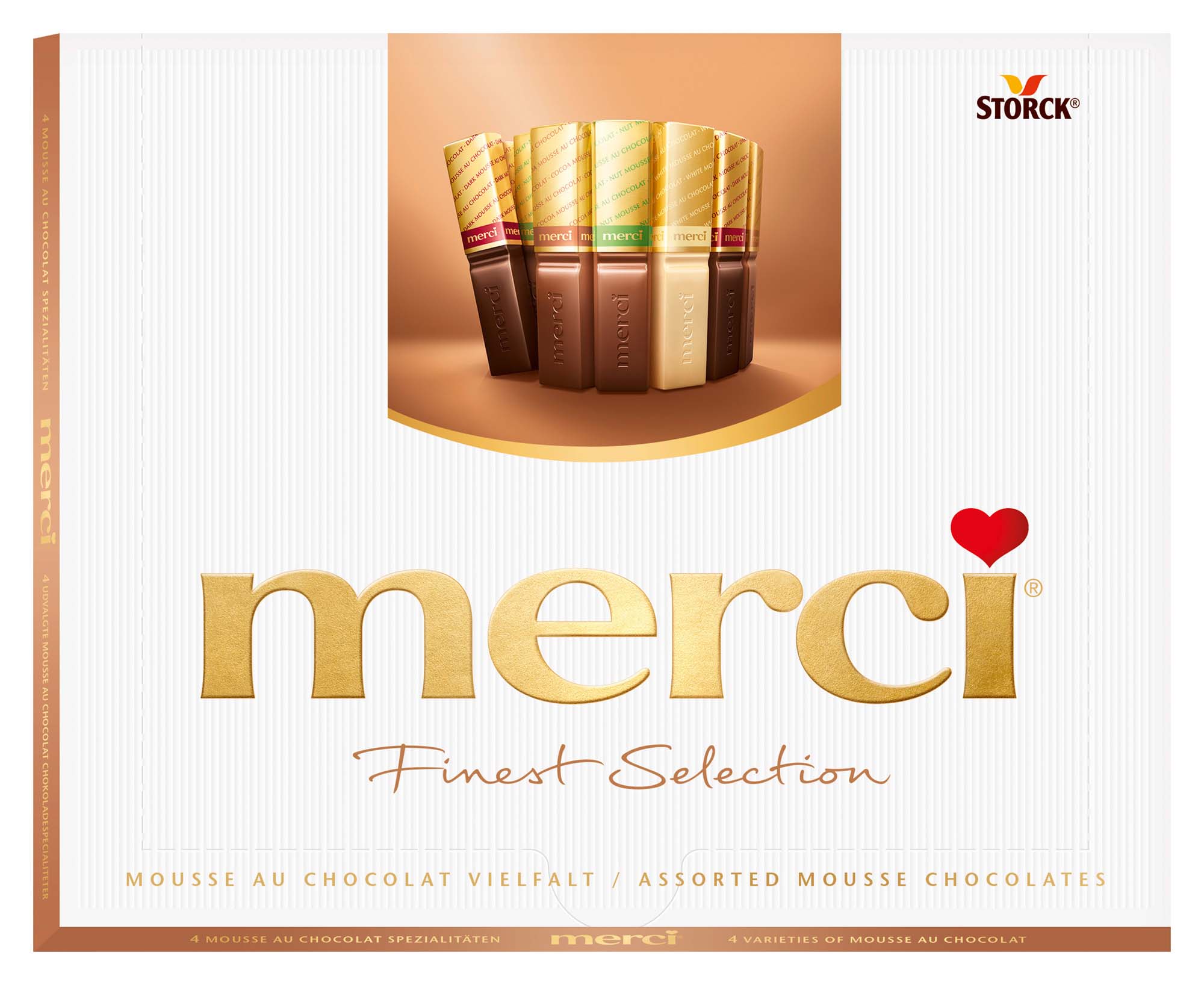 Der Klassiker von merci: Feinste Schokoladen in Stäbchenform, hergestellt aus erlesenen Zutaten und einzeln golden verpackt. merci Finest Selection ist Schokoladengenuss in großer Vielfalt: Genießen Sie Stück für Stück unsere liebevoll ausgewählten, hochwertigen Schokoladen, raffinierten Füllungen und einzigartigen Kompositionen. Die merci Mousse au Chocolat beeindruckt mit 4 verschiedenen köstlich gefüllten Sorten: Weiße Mousse, Dunkle Mousse, Kakao Mousse und Haselnuss Mousse in zarter Schokoladenhülse. Somit ist sie die fünfte sorgfältig ausgesuchte Schokoladenvariation in der merci Finest Selection Familie und ein absolutes Muss für jeden Schokoladengenießer. Die merci Finest Selection Mousse au Chocolat wird Augen zum Strahlen bringen!
