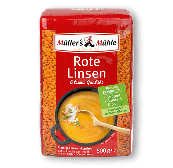 Müller´s Mühle Rote Linsen sind geschält, haben eine kurze Garzeit ohne Einweichen, kochen weich und nehmen gut den Geschmack anderer Zutaten an. Mit den Müller´s Mühle Rote Linsen gelingen Ihnen abwechslungsreiche Wohlfühlgerichte wie Suppen, Salate und Dips. Für Sie, Ihre Familie und Freunde – garantiert lecker.