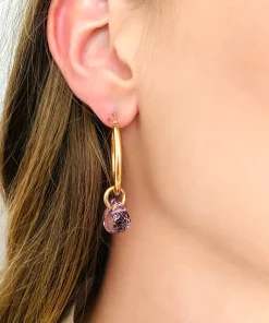 Nicola Hinrichsen Ohrringe “Creolen” Rosegold Amethyst. Facettierte Edelsteintropfen an eleganten Creolen fangen das Licht ein und reflektieren in Edelsteinfarben. Ein wahrer Lichtblick!