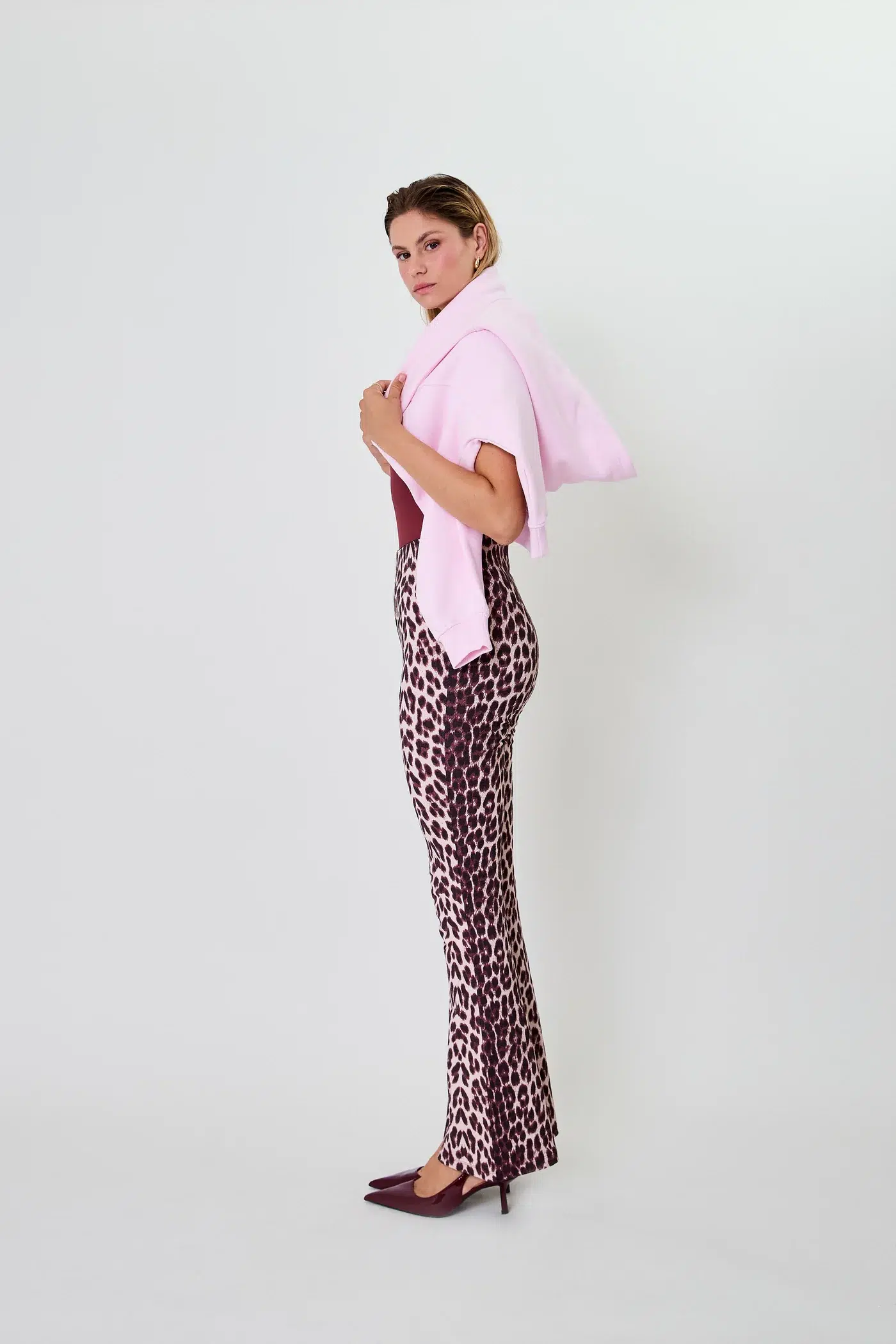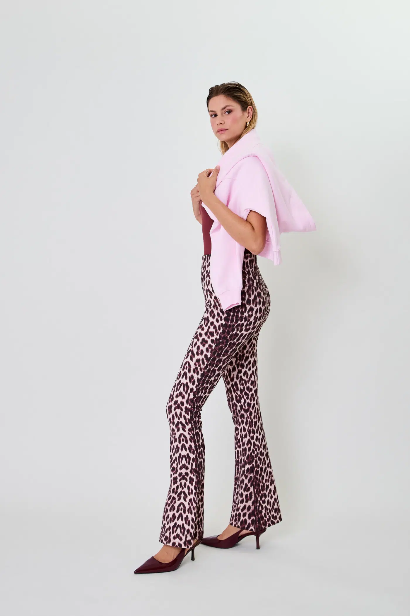 Oh April Leggings “Tia Bootcut Leo Cherrywood”. Die Tia Bootcut Leggings von Oh April bringt frischen Wind in deine Alltagsgarderobe – mit einem Hauch Retro-Flair und einem modernen Twist. In der angesagten Farbe Leo Cherrywood zieht sie garantiert alle Blicke auf sich und wird zum stilvollen Statement für entspannte, aber dennoch elegante Looks. Gefertigt aus einem geschmeidigen Materialmix aus 77 % Viskose, 18 % Polyamid und 5 % Elastan, überzeugt Tia durch ihre weiche Haptik, angenehme Dehnbarkeit und eine schmeichelhafte Silhouette. Die extra lange Passform schmiegt sich vom Bund bis zum Knie an deinen Körper, bevor das Bein im leichten Bootcut– also mit einem ausgestellten Schlag – stilvoll ausläuft. Dieser Schnitt zaubert eine elegante Beinlinie und sorgt für einen modernen, femininen Look mit Vintage-Vibes. Die Tia Leggings ist nicht für sportliche Aktivitäten gedacht, sondern als modisches Key-Piece für den Alltag, für Office-Looks mit Stil oder entspannte Dinner-Dates.