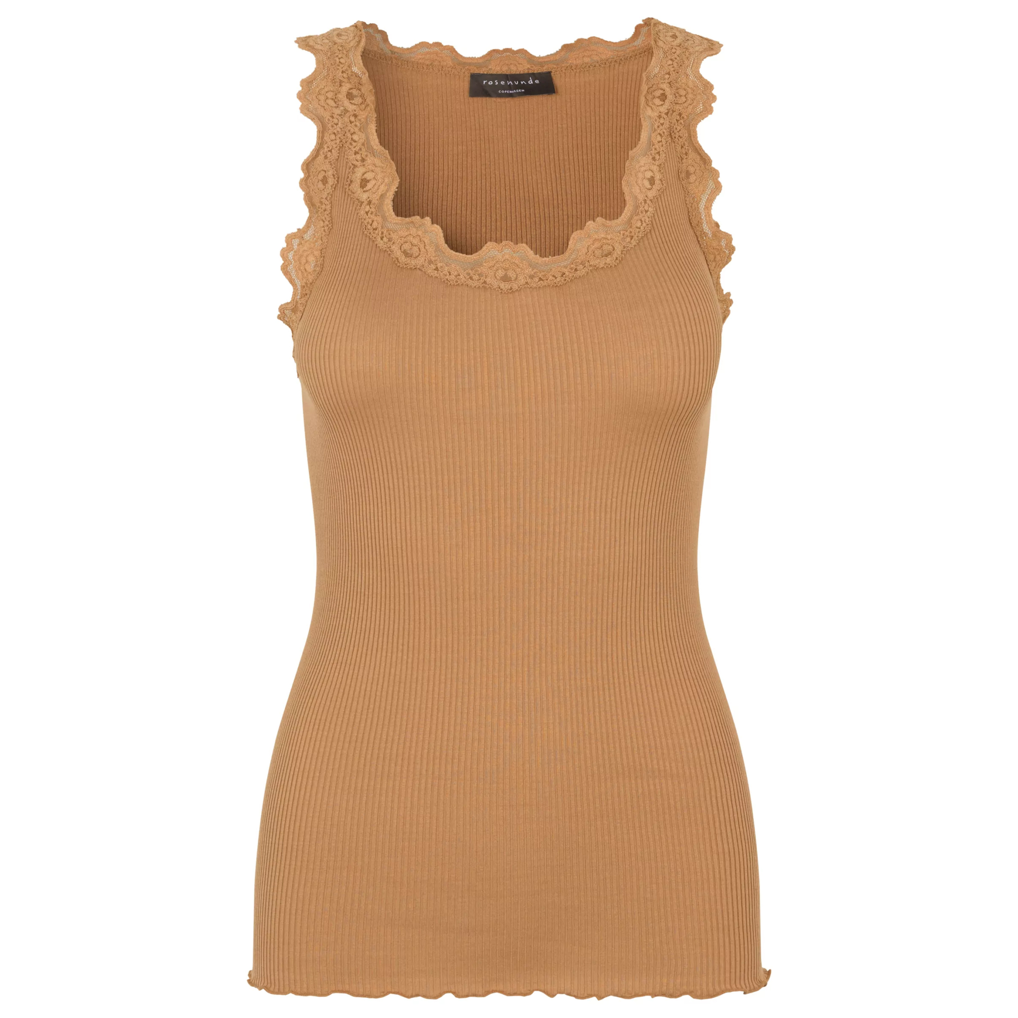 Rosemunde Spitzen Top Almond. Feminines Strickoberteil aus weicher Seide mit einem Rundhalsausschnitt. Entworfen mit etwas Extralänge und schöner Spitze im Ausschnitt. Tragen Sie es unter einer Bluse oder einem Blazer für einen stilvollen Auftritt.