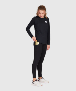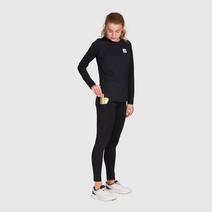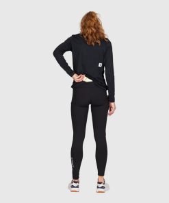 Die SAYSKY Combat+ Tights ist eine lange Lauftights für Frauen in Schwarz aus recyceltem Polyester. Sie haben ein gewebtes, reflektierendes SAYSKY Logo auf der Vorderseite und ein reflektierendes SAYSKY Logo an der linken Wade. Außerdem haben sie Seitentaschen. Die Passform ist schmal und hat einen normalen Bund. Diese Lauftights sind ideal für die Übergangssaison.