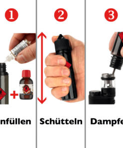 Nach dem Auffüllen schüttelst du die Flasche gut durch, damit sich die einzelnen Bestandteile vermischen. Jetzt steht dem Genuss nichts mehr im Wege. Du kannst direkt losdampfen!