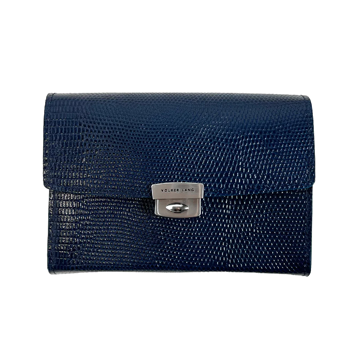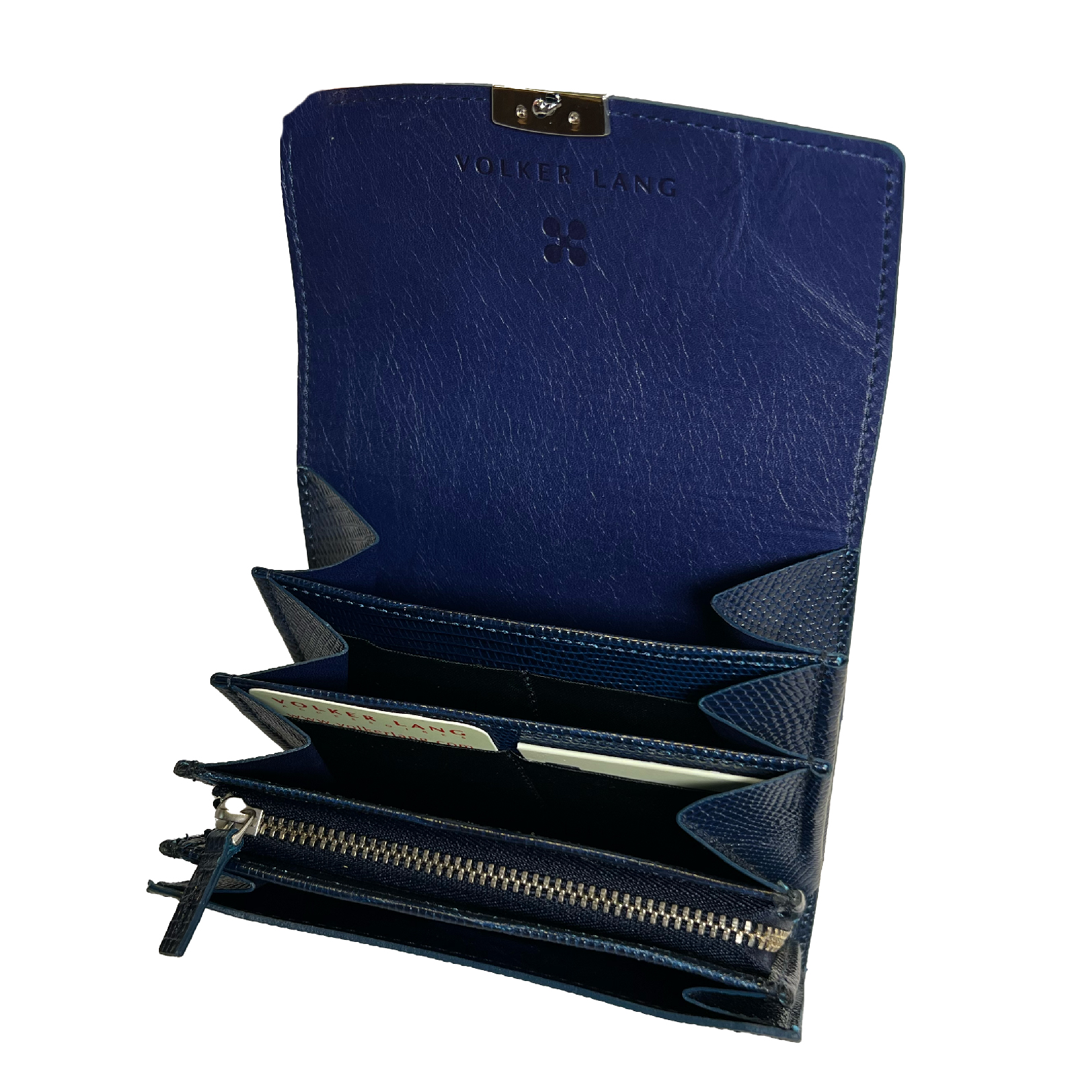 Volker Lang Portemonnaie/Geldbörse “Kopeke” Waran Sapphire. Kompakt. Klar. Elegant. Eindeutig. Diese Kellnerbörse hat acht Kartenfächer, vier Innenfächer und ein doppeltes Münzfach mit Reißverschluss. Ihre Form ist elegant. Auch sportlich. Auf jeden Fall luxuriös. Ob Sie ordnungsliebend oder einfach nur schnell sind: Die Börse ist sicher und schnell in der Handhabung.