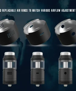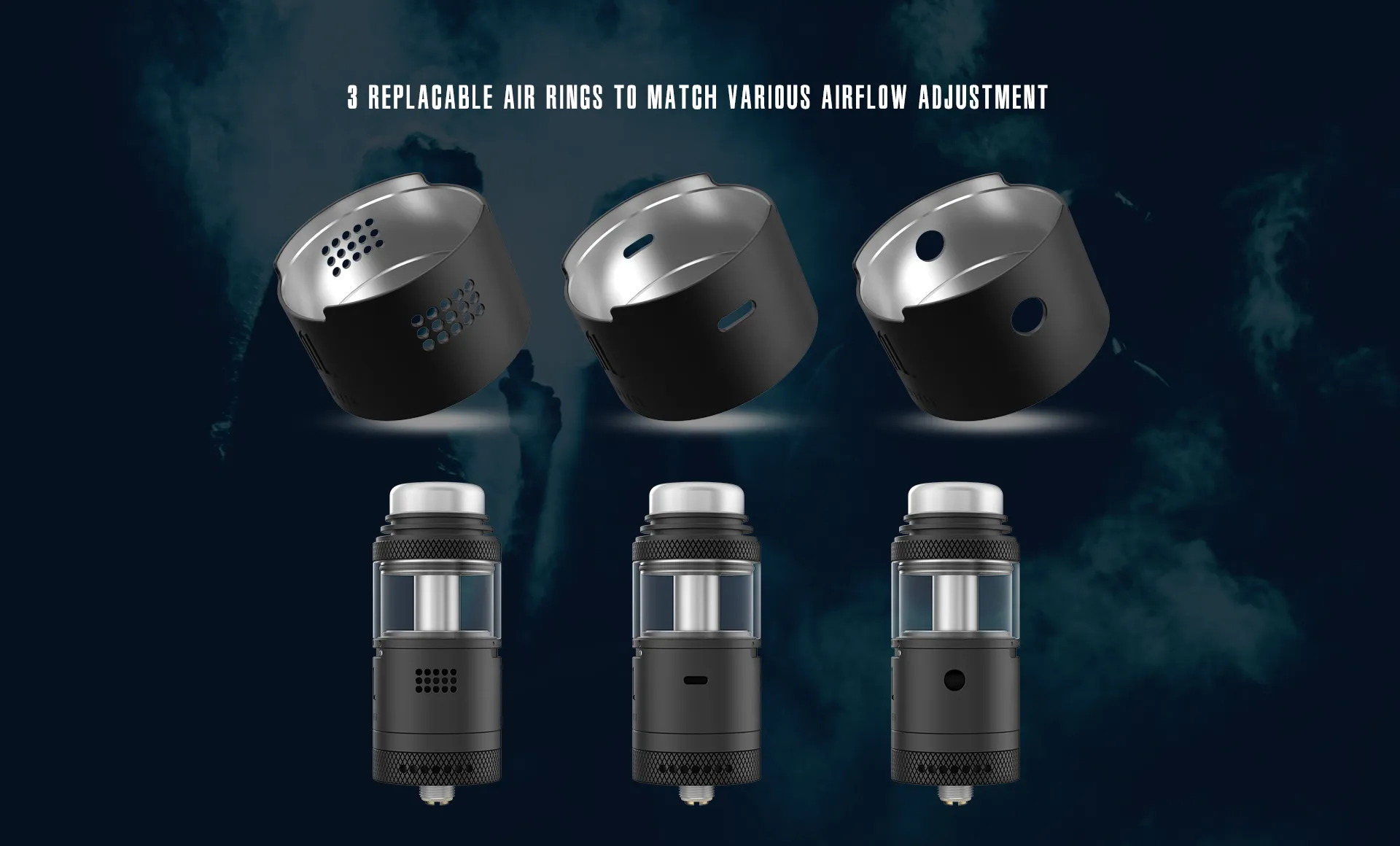Die doppelte Luftführung: leitet die Luft sowohl seitlich als auch von unten zur Wicklung. Dabei lassen sich die einzelnen Lufteinlässe getrennt voneinander präzise regulieren und bieten somit eine enorme Flexibilität bei der Justierung des Luftstroms. Außerdem gibt es noch drei verschiedene Airflow Kappen, die eine individuelle Einstellung ermöglichen und somit MLT als auch DL Dampfern gerecht werden.